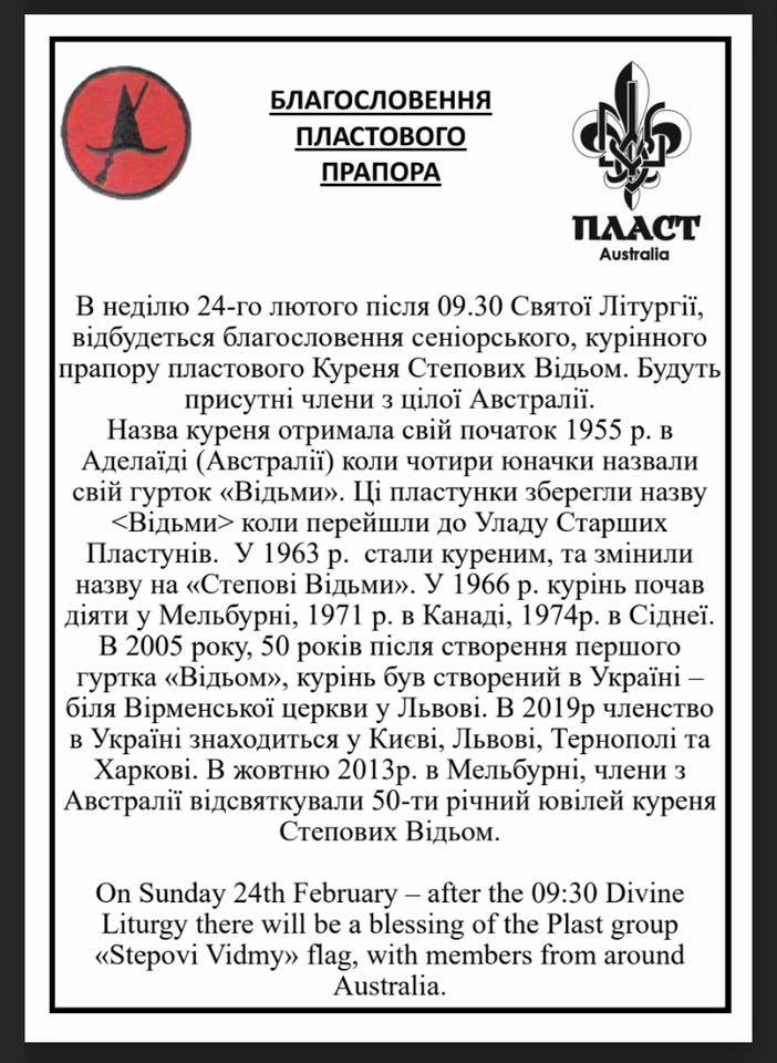 Благословення нового прапору 32-го куреня Уладу Пластунів Сеніорів «Степові Відьми» відбудеться у неділю 24-го лютого 2019 р. в Українській Католицькій Катедрі, Норт Мельбурн, Австралія, після Служби Божої о 9:30 ранку.